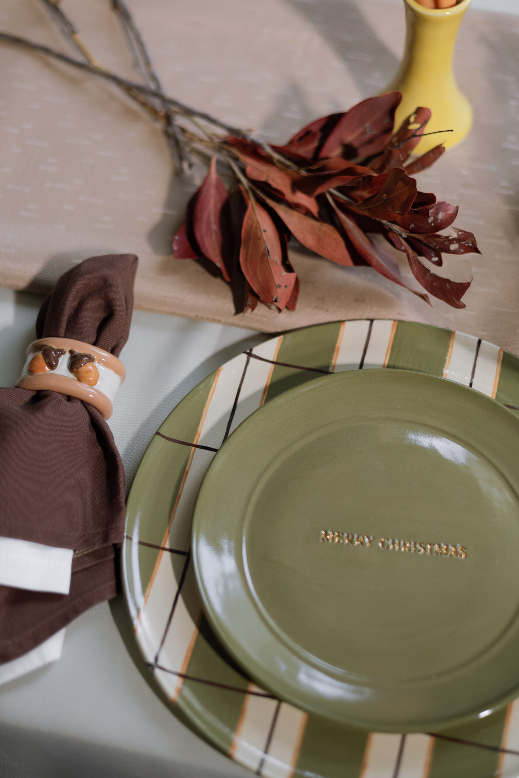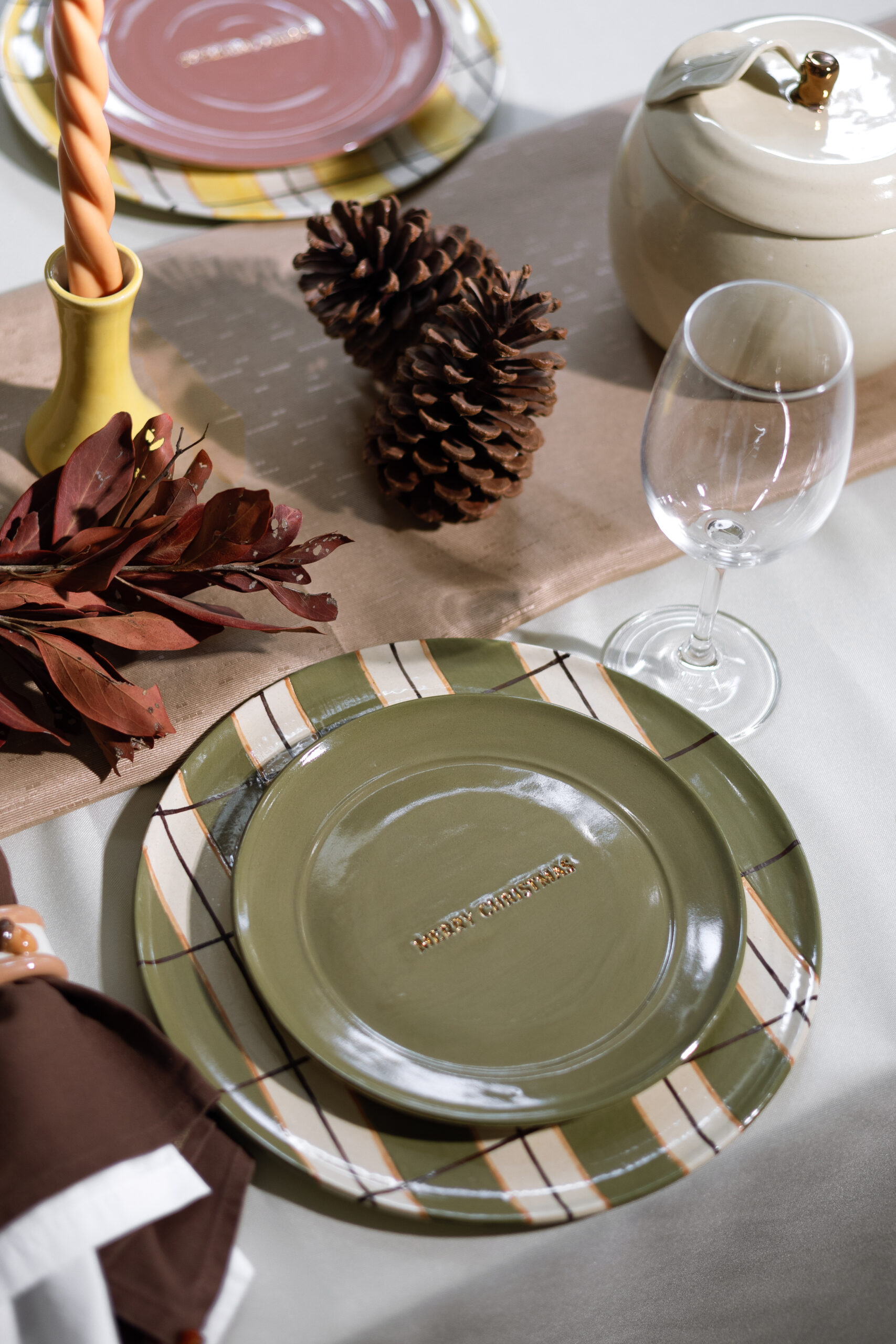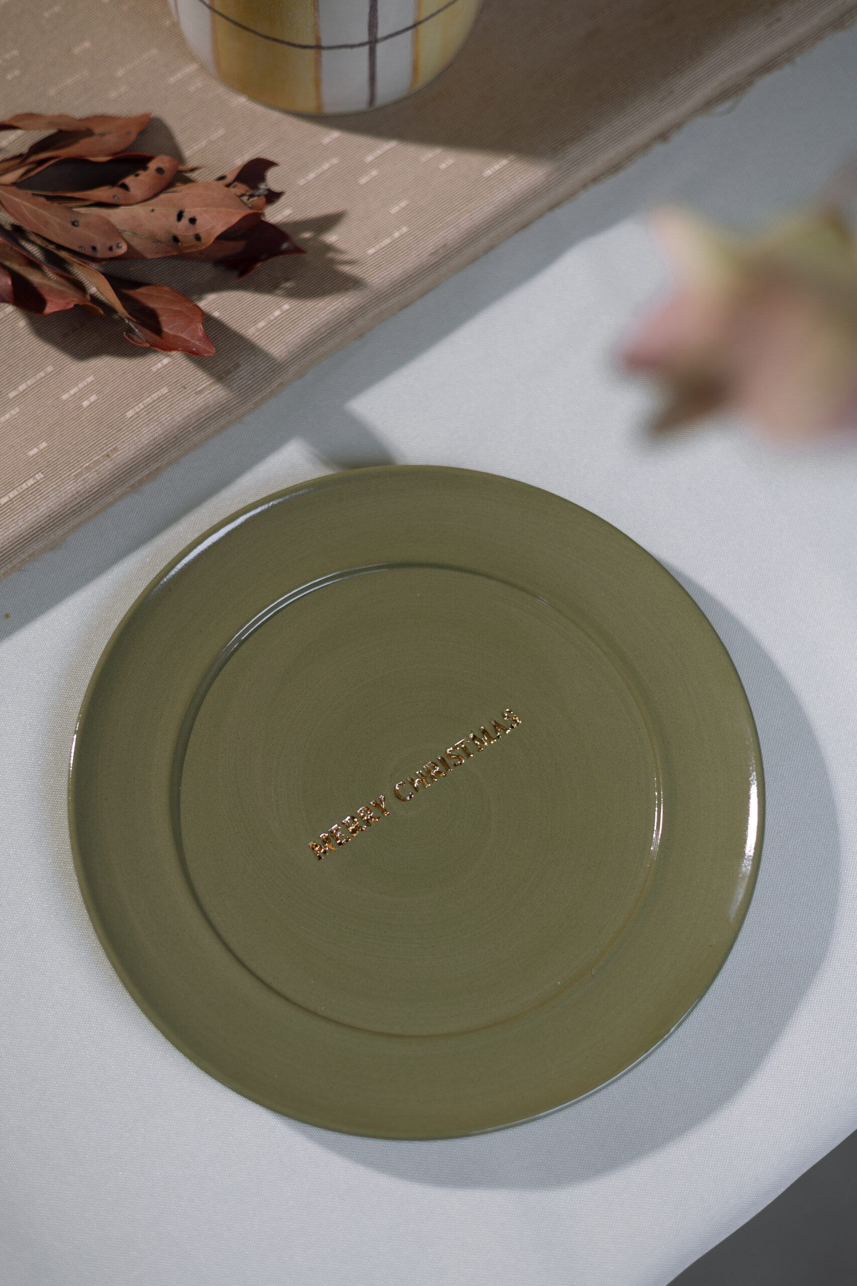 Prato de sobremesa merry christmas com detalhe em ouro liquido.